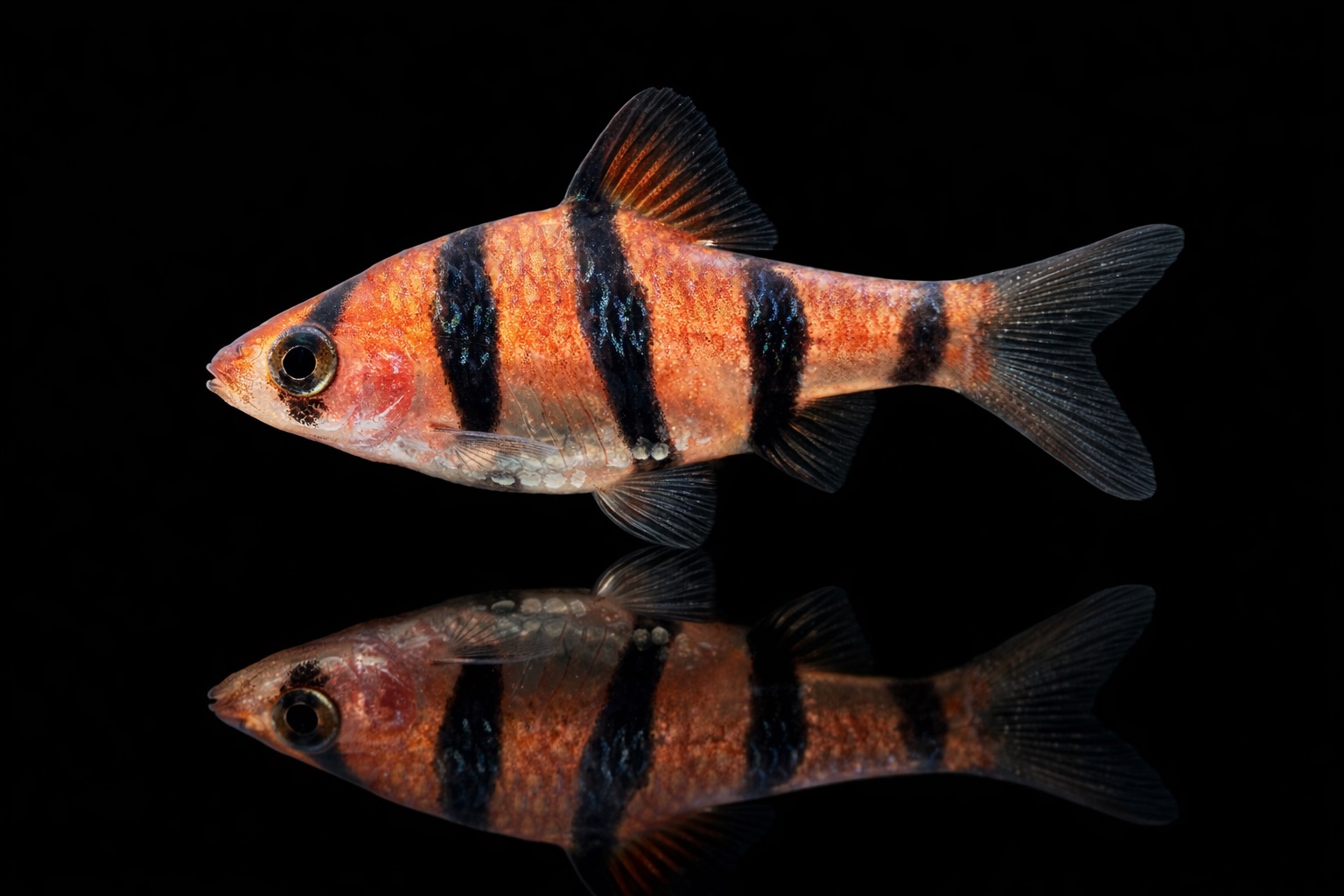 Die Fünfgürtelbarbe ist eine tolle und farbenfrohe Barbe für mittelgroße Aquarien. Rote Flossen und die fünf dunklen Querstreifen auf gelblichem Hintergrund treffen hier auf ein eher ruhiges Gemüt. Desmopuntius pentazona ist ein Gruppenfisch, der gerne in einem etwas größerem Schwarm gehalten werden sollte. Die Fünfgürtelbarbe wird häufig mit der Sumatrabarbe verwechselt, diese ist aber deutlich hochrückiger und besitzt nur vier "Sträflingsstreifen". Als Wasserwerte werden leicht saures Wasser und weiche Parameter bevorzugt, die Temperatur sollte dabei im Bereich von 24 bis 28 °C liegen.