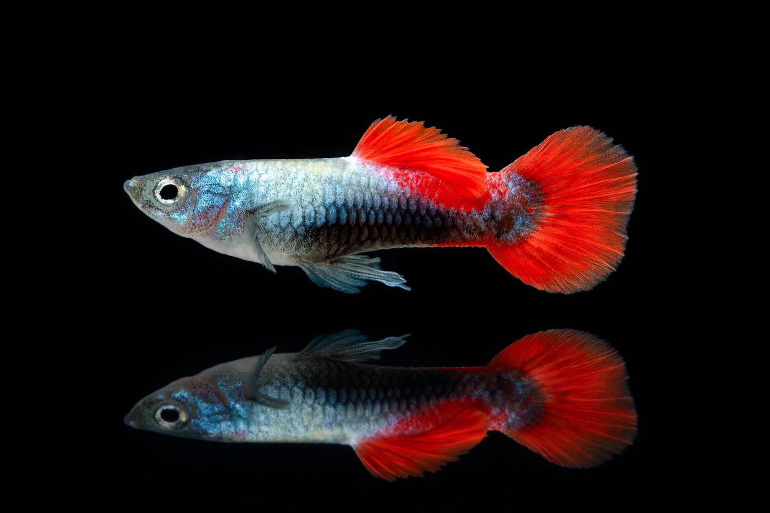 Der Guppy Tuxedo Platinum (Poecilia reticulata) präsentiert sich mit metallisch glänzendem Platinum-Körper, kombiniert mit feurig roten Schwanz- und Flossenpartien – ein echter Hingucker im Aquarium. Diese Zuchtform stammt von wildtypischem Guppy-Material Südamerikas ab und wurde durch gezielte Zucht perfektioniert. Männchen zeigen intensivere Farben und markante Tuxedo-Zeichnung; Weibchen sind dezenter.