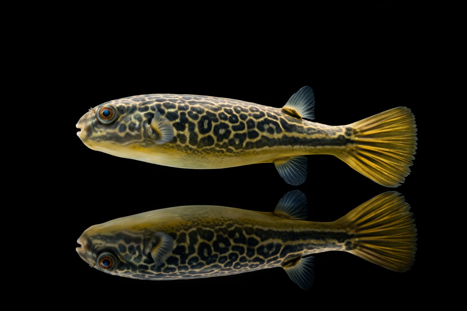 Der Goldringel-Kugelfisch (Tetraodon mbu) besticht durch seine sehr feine Körperzeichnung. Dieser sehr groß werdende Kugelfische (Endgröße bis 75 cm) benötigt ein Aquarium in der Größe von 250*100*100cm Kantenlänge. Die Aquariengröße sollte idealerweise mit dem Fisch mitwachsen. Tetraodon mbu stammt aus Afrika und ist dort weit verbreitet vom Tanganjika See im Osten Afrikas bis hin in die Republik Kongo im Westen des Kontinent.