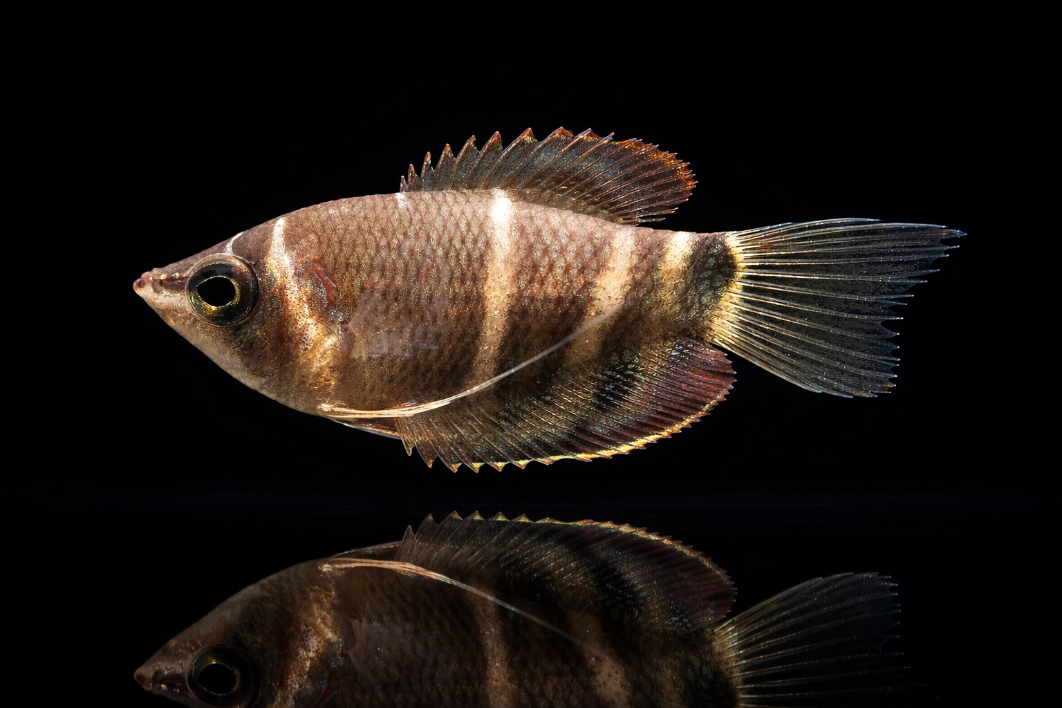 Der Schokoladengurami ist ein eher kleinerer Labyrinthfisch (Endgröße ca. 6 cm) mit einer hübschen braunen Grundfärbung und mehreren hellgelben Querstreifen. Sphaerichthys osphromenoides gehört zu den Labyrinthfischen und ist ein Gurami (Osphronemidae). Er stammt aus Südostasien. Geschlechtsunterschiede sind oft nicht leicht zu erkennen. Erst wenn die Tiere gut eingewöhnt sind, erkennt man die Männchen an den verlängerten Rücken- und Afterflossen.
