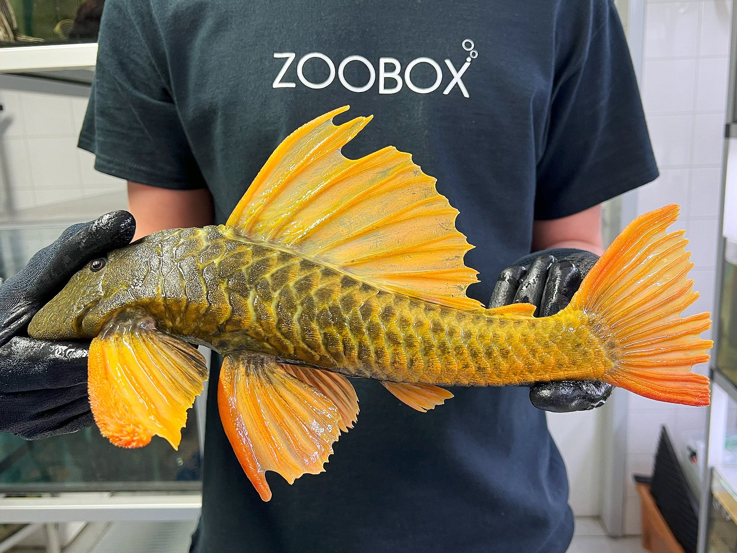 We offer this rare and visually stunning Golden Sailfin Catfish starting at a size of 30 cm using the WYSIWYG method ("What You See Is What You Get"). This means you will receive exactly the individual shown in the photos. This allows you to get a precise impression of the fish’s coloration, pattern, and body shape before purchase – especially important for such magnificent one-of-a-kind specimens!
