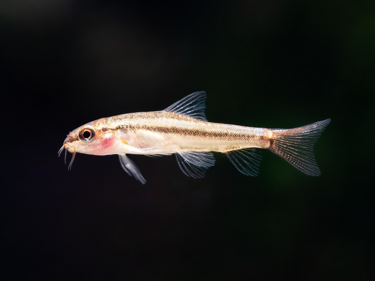 Die Rosy Zwergschmerle besitzt einen schlanken, leicht durchscheinenden Körper, der je nach Stimmung und Beleuchtung einen sanften rosafarbenen Schimmer zeigen kann. Gerade diese zarte Färbung hat der Roten Zwergschmerle ihren populären Namen eingebracht. Entlang der Flanken können sich feine Muster oder Schattenlinien zeigen, die den Fisch im Bodengrund hervorragend tarnen. Wie viele Schmerlen hat auch Yunnanilus sp. Rosy kleine Barteln rund um das Maul. Diese dienen als Tastorgane, mit denen der Fisch im Substrat nach Futter sucht. Ihre Bewegungen wirken dabei stets neugierig und aktiv. Oft sieht man die Tiere gemeinsam über den Boden huschen oder zwischen Pflanzen und Steinen hindurchgleiten.