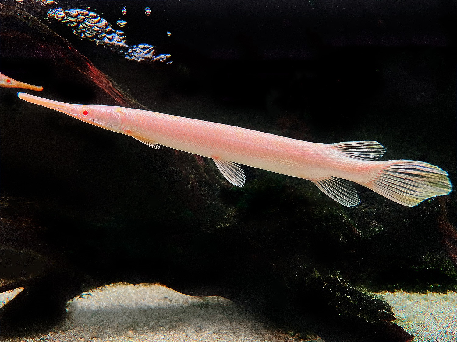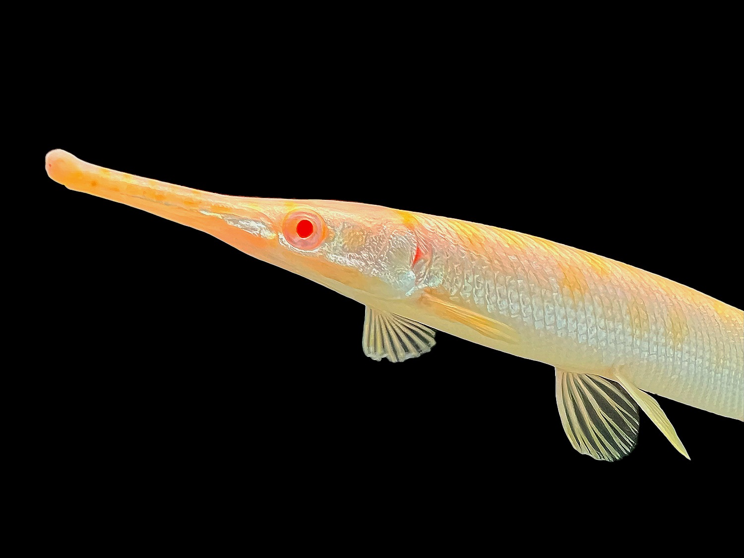Der Albino Florida-Gar (Lepisosteus platyrhincus) ist eine seltene Farbvariante des Florida-Gars, die sich durch eine cremeweiße bis goldene Körperfärbung und auffällige rote Augen auszeichnet. Diese einzigartige Erscheinung macht ihn zu einem besonderen Blickfang in jedem Aquarium. Der Florida-Gar ist in den Süßgewässern des südöstlichen Nordamerikas beheimatet, insbesondere in Florida und Teilen Georgias. Er bevorzugt langsam fließende Flüsse, Kanäle und Seen mit schlammigem oder sandigem Boden und dichter Unterwasservegetation. Typisch für diese Art ist der langgestreckte, zylindrische Körper mit einer kurzen, breiten Schnauze. Die Haut ist mit harten Ganoidschuppen bedeckt, die einen effektiven Schutz bieten. Die Flossen sind ebenfalls gefleckt, was dem Fisch ein charakteristisches Erscheinungsbild verleiht.